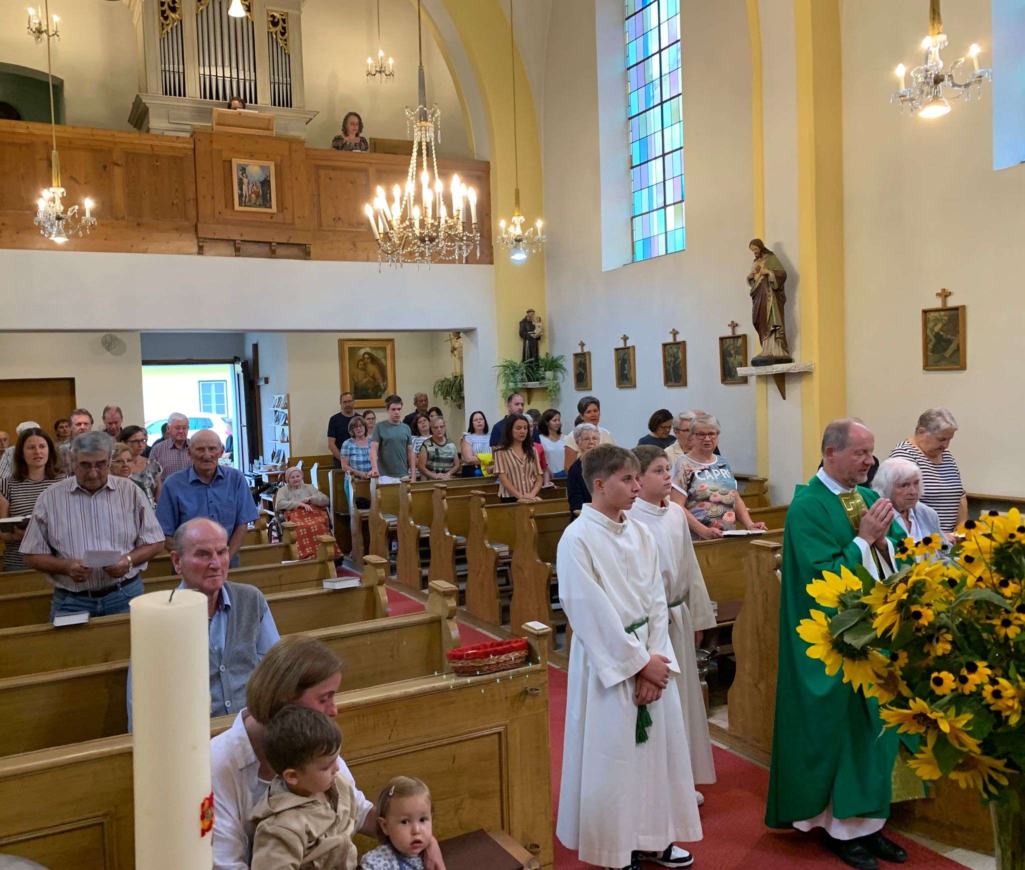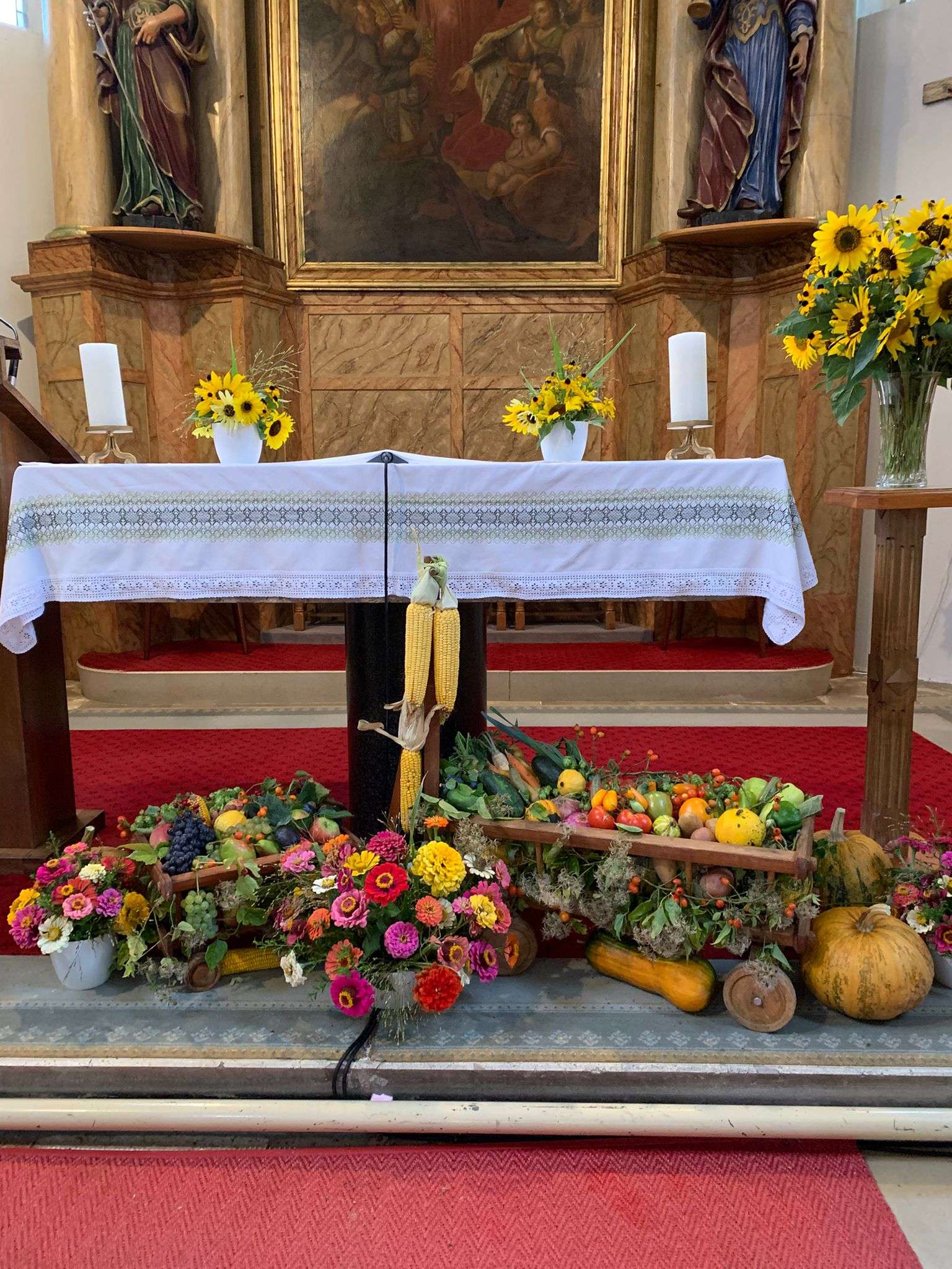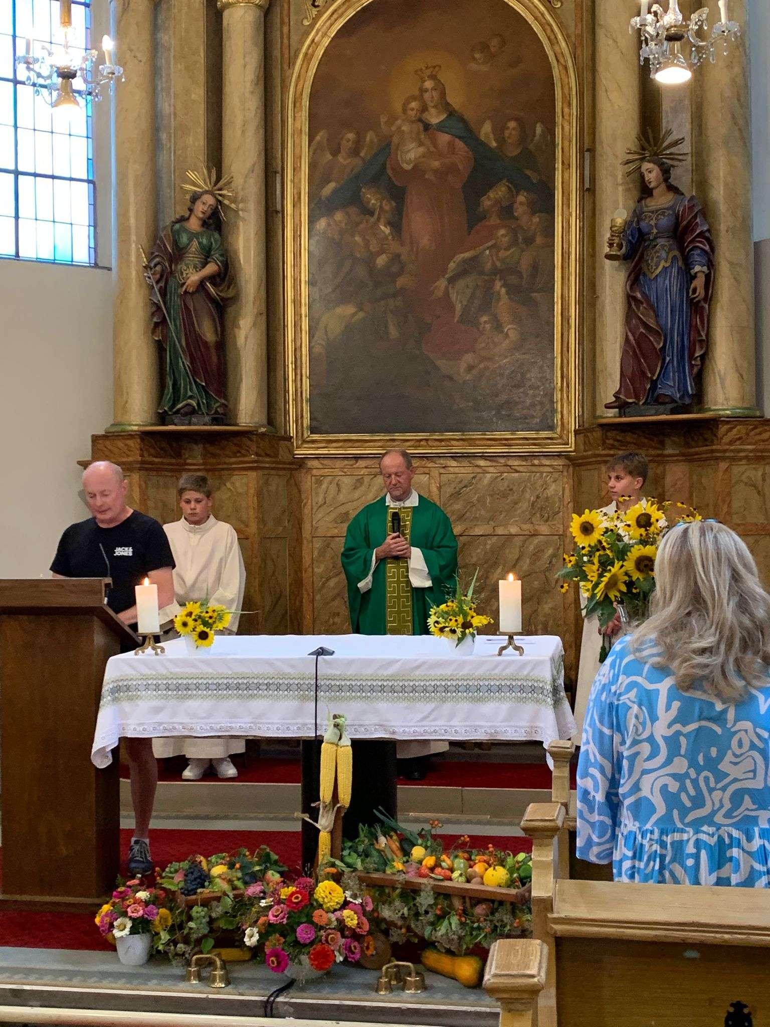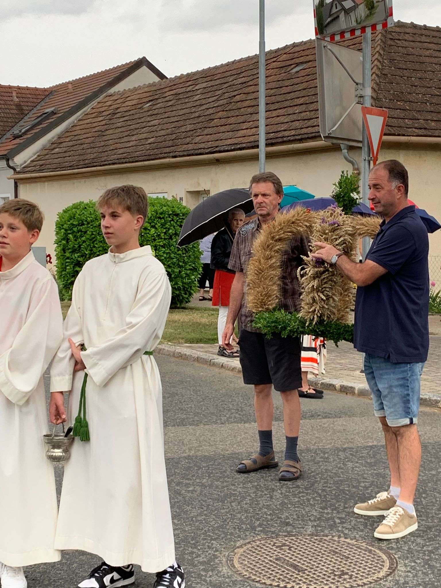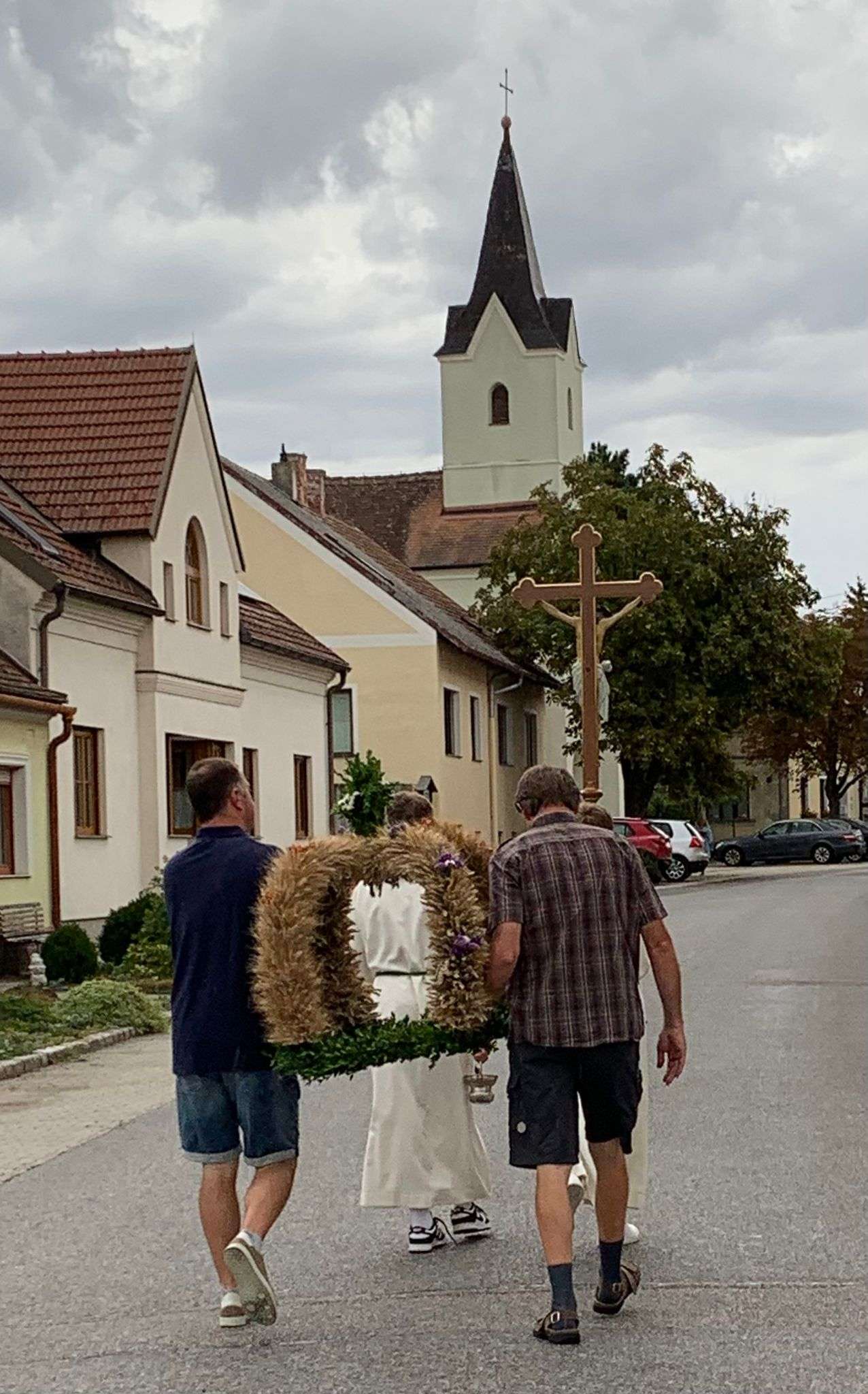 Wie jedes Jahr versammelten sich viele aus der Pfarrgemeinde beim Dostalkreuz, wo die Erntekrone und die Erntegaben gesegnet wurden. Anschließend zogen wir in einer feierlichen Prozession zur Kirche. Dort zelebrierte Pfarrer Christoph mit uns die Erntedankmesse.