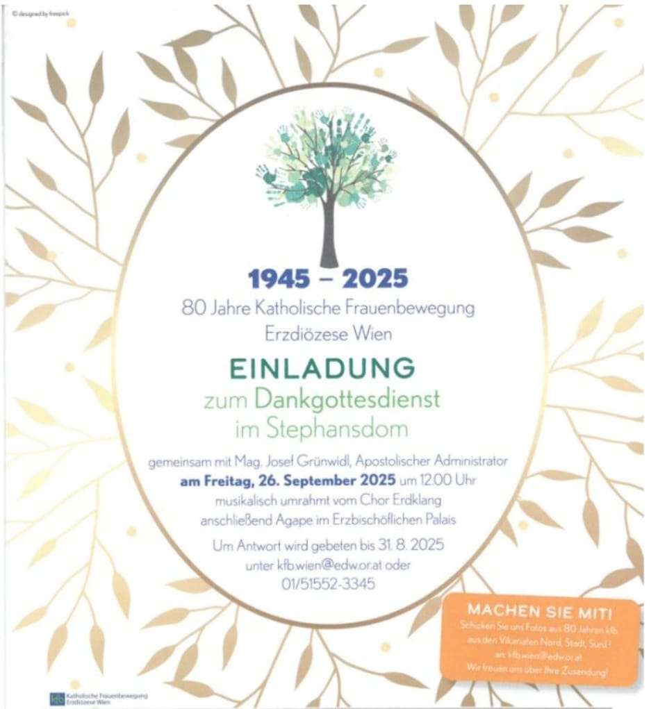 Die katholische Frauenbewegung der Erzdiözese Wien lädt ein zum Dankgottesdienst [...]